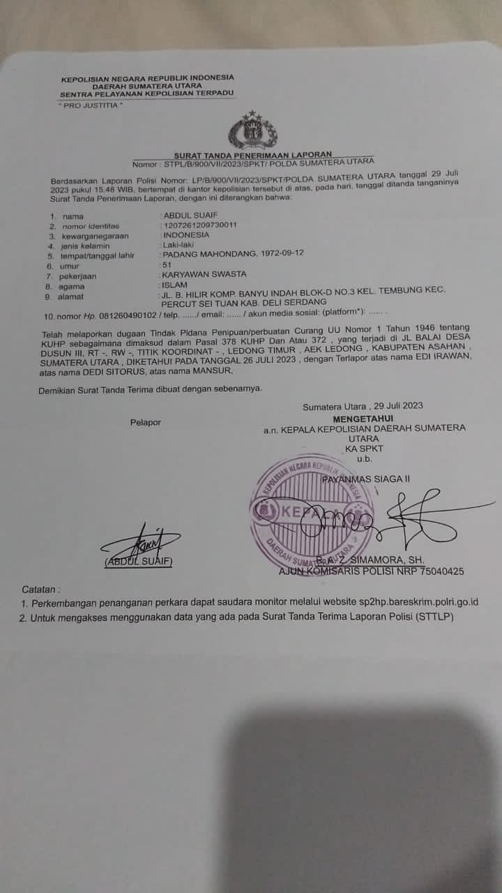 Menurut pengakuan Sueif, dirinya dua tahun lebih bolak balik ke Polda Sumut mempertanyakan laporannya LP/B/900/VII/SPKT/ POLDA SUMATERA UTARA (SUMUT), tanggal 29 Juli 2023.